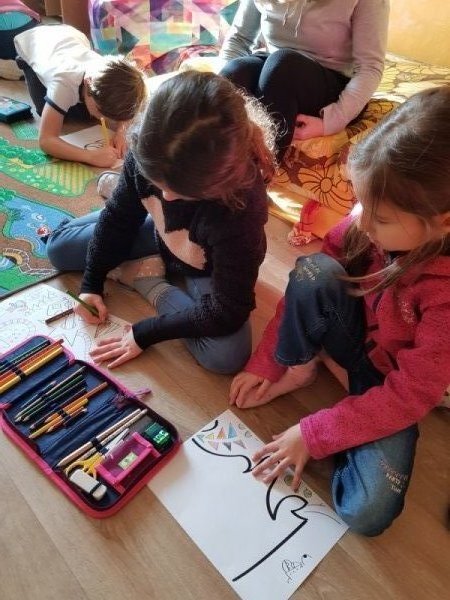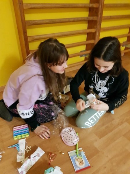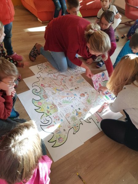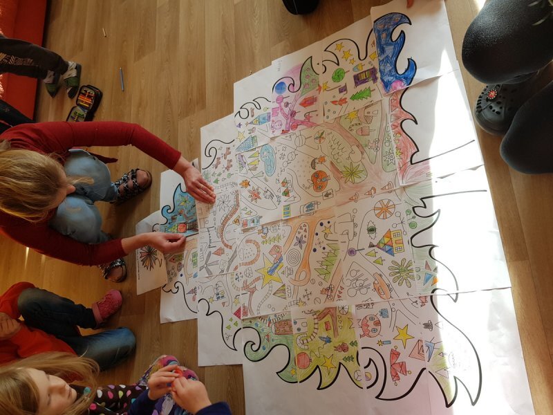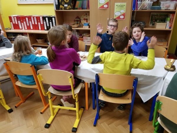 Po přestávce 1. a 2. ročník spojil síly při aktivitě vybarvování částí skládanky a pak skládání v jeden celek. Kromě toho, že jsme si zavybarovavali a zaskládali, jsme si také uvědomili, že dokud vidíme každý jen část, můžeme se lehko splést v tom, co to vlastně vidíme, ale když dáme naše části dohromady, hned máme obrázek ucelenější a můžeme si být o něco jistější. To, co se mohlo zpočátku po dílech jevit jako rozbouřené moře, byl nakonec krásný vánoční strom.