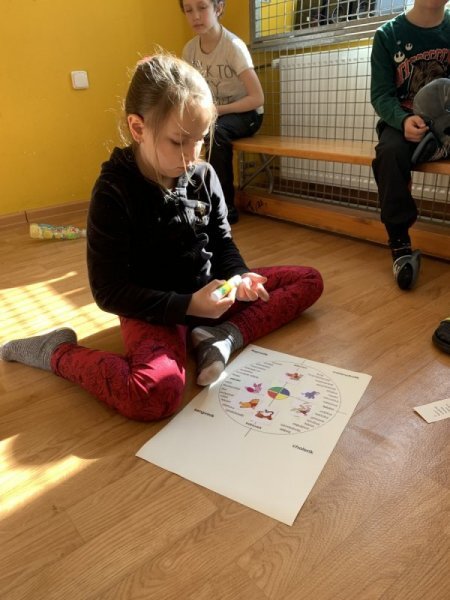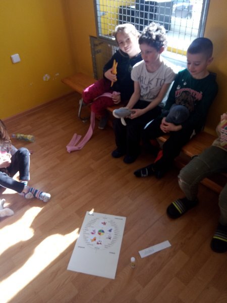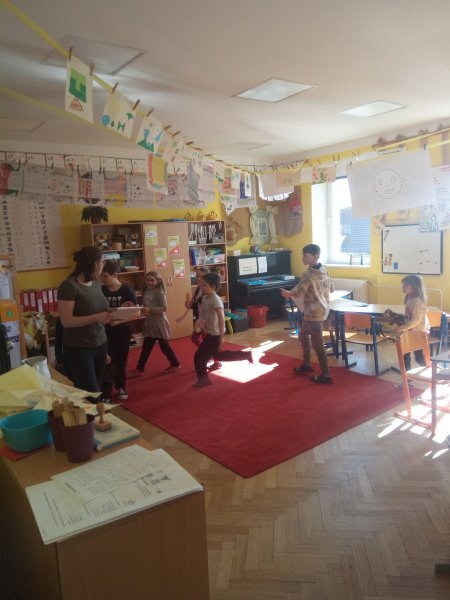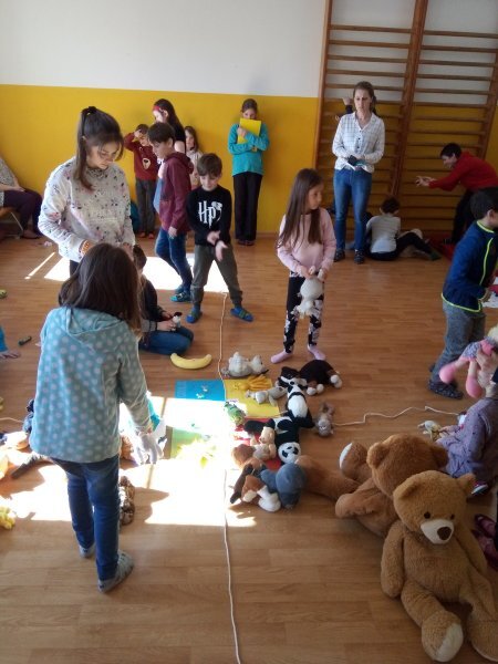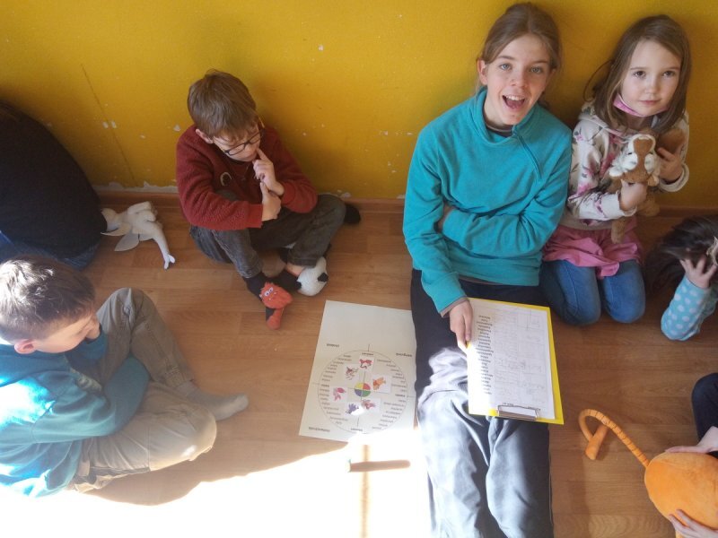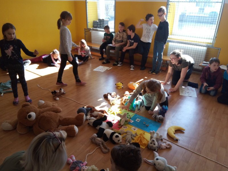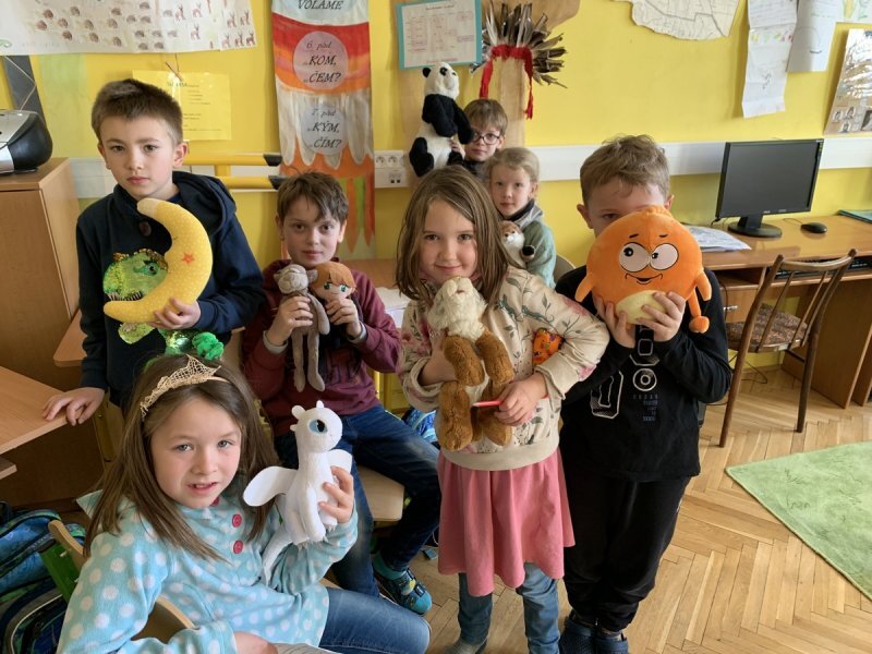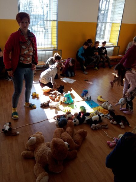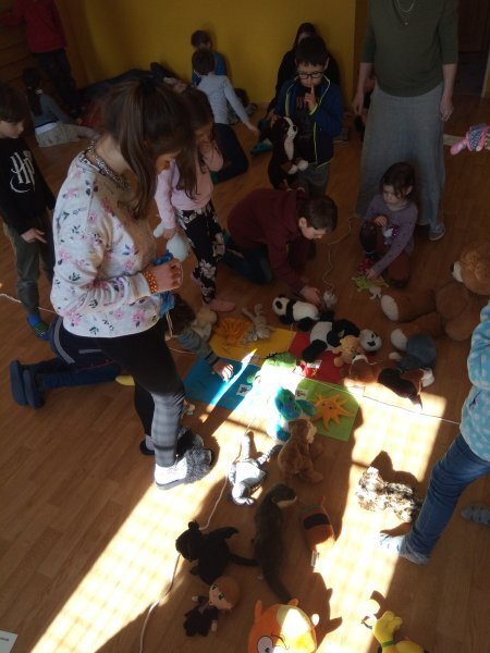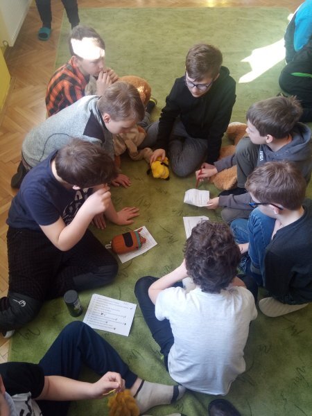 Potom jsme se šli seznámit s jednotlivými zvířátky. Každé zvířátko má nějaké výrazné vlasnosti, naším úkolem bylo je co nejlépe popsat. Na závěr jsme si pak ukázalo, že tyto vlastnosti tvoří prostor lidských charakterů, po které používáme slova jako sangvinik, cholerik, melancholik a flegmatik. Do tohoto prostoru jsme umístili zvířátka ze Stokorcového lesa a na závěr i našeho plyšáčka - který zastupoval nás samotné, jak se vidíme.