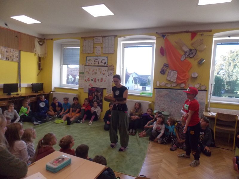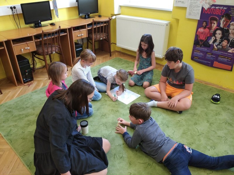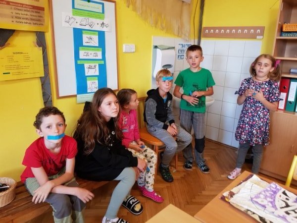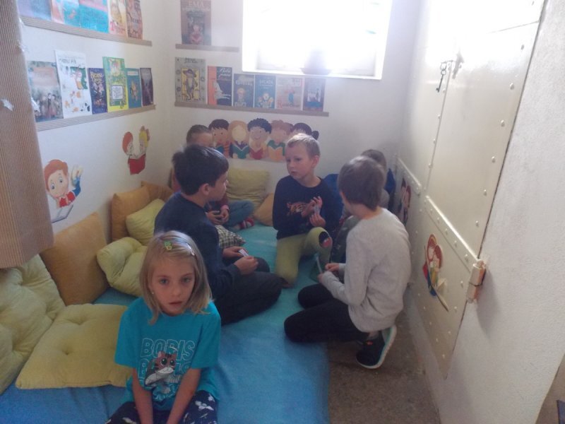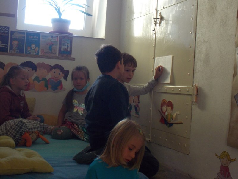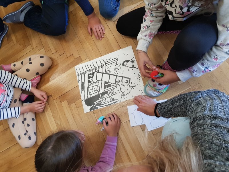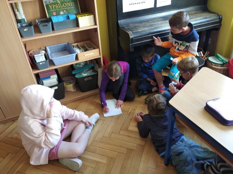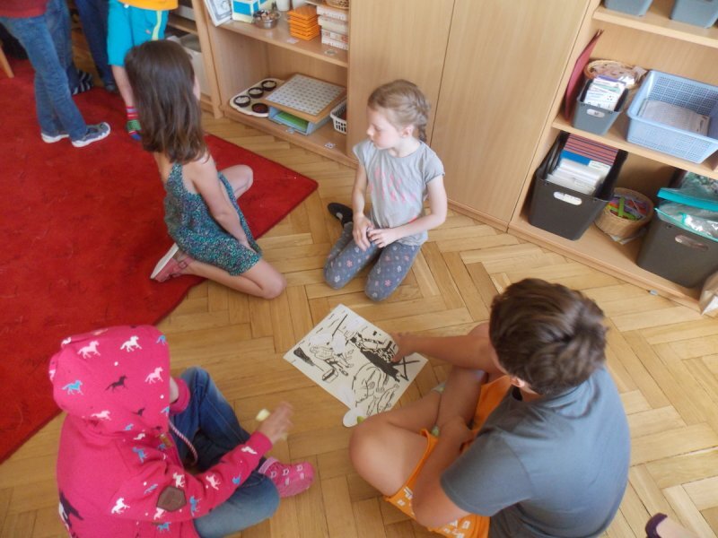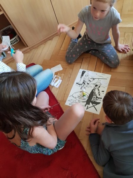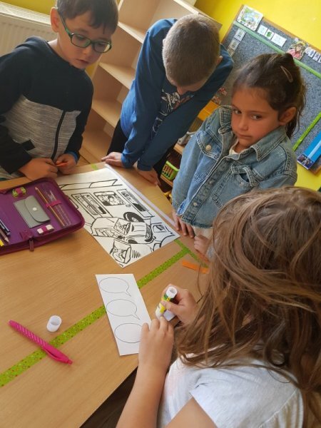 Abychom nebyli ochuzeni o příběh, který jsme si nakonec nemohli přečíst, zkusili jsme vytvořit naše vlastní mikropříběhy z ilustrací obyčejných situací v životě. Děti se ve skupinách dohodly, co se podle nich na obrázcích odehrává a pomocí komiksových bublin vdechly postavám (i věcem) v obrázcích děj.