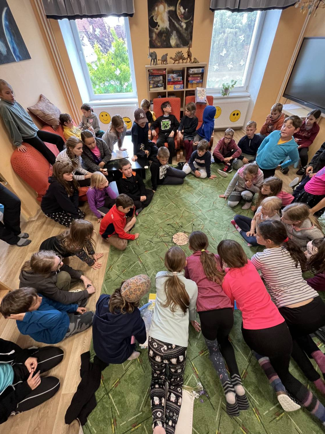 Poslední letošní centra aktivit se nesla v duchu tajemna, jelikož se nám zjevila mapa hvězdné oblohy, uprostřed níž jsme se měli všichni „sejít“ a najít indicii k tomu, co si dál počít s hledáním elixíru pro Rudolfa II. Museli jsme se tedy dát rychle do práce a v CA spojit síly a vybojovat co nejvíce kroků k posunutí po hvězdné mapě. V úterý už jsme se společnému cíli, tedy středu mapy, sice blížili, ale pořád nám ještě kousek zbýval. Ve středu jsme poslední kroky museli ještě vybojovat v jednotlivých třídách, tedy ve třídě ALCHYMISTŮ, ASTROLOGŮ A MÁGŮ. Podařilo se. Uprostřed mapy byl ukrytý vzkaz, kde maličkým písmem stálo, že se máme vydat na cestu, po které jsme kráčeli již v září a že když splníme, co nám bude uloženo, dozvíme se opět víc. Splnili jsme s vypětím všech sil, psychických i fyzických, v podmínkách nelehkých, ba přímo dešťových a bahnitých, všechno, co nám bylo na cestě uloženo a poskládali jsme další vzkaz. Ten odkazoval na to, že je třeba poslouchat i ty nejmladší z nás a že i oni mohou mít někdy řešení ve svých rukách. A doslova měli. Prvňáci na začátku roku dostali zvláštní medaile. Ty se daly poskládat jako puzzle a na jejich rubu jsme k překvapení všech našli cíl naší další cesty. „Hajnice“. Tak snad tam už konečně nalezneme elixír pro císaře…